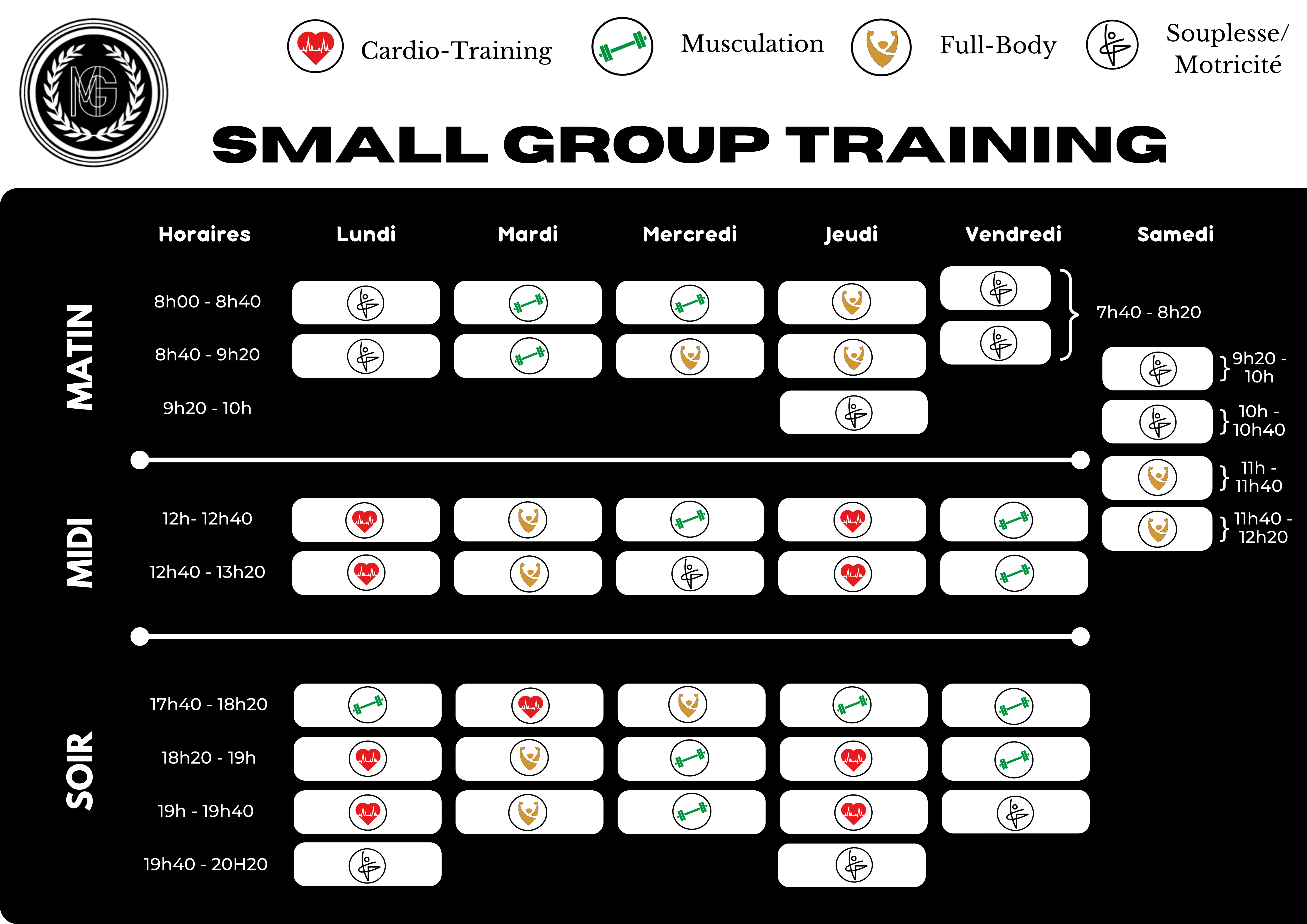 Nous proposons des horaires flexibles pour nos sessions de Small Group Training afin de s’adapter à votre emploi du temps. Que vous soyez un lève-tôt ou que vous préfériez vous entraîner en soirée, vous trouverez des créneaux qui vous conviennent à Mon Gymnase.